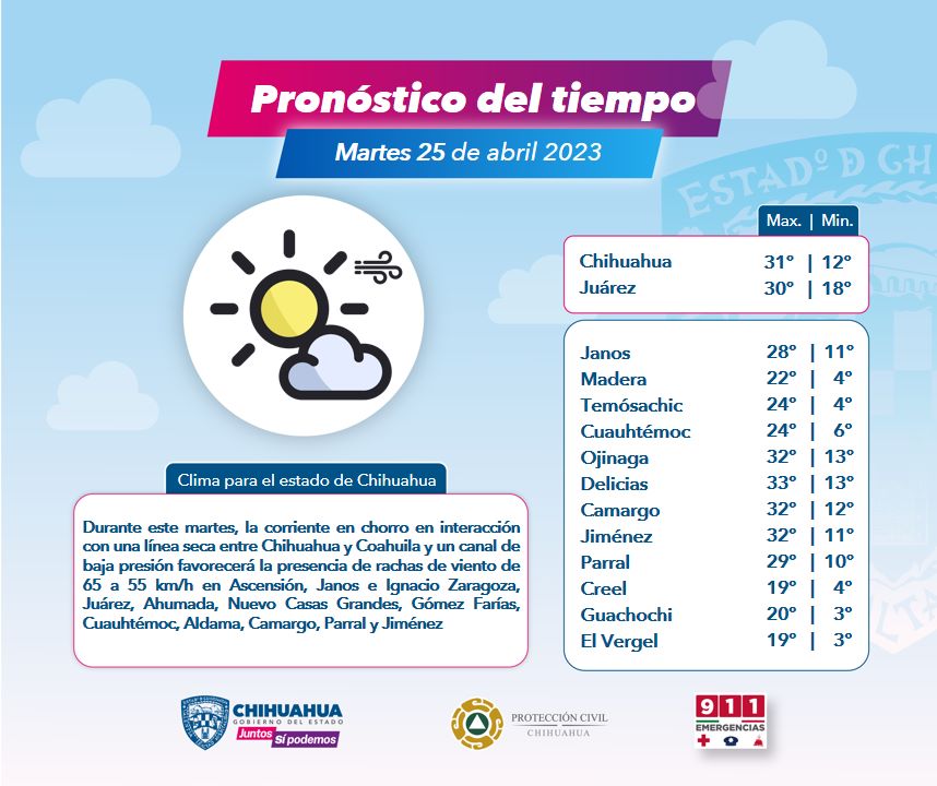 Con base en la información emitida por el Servicio Meteorológico Nacional, la CEPC dio a conocer que las ráfagas de viento pueden superar los 65 y 70 kilómetros por hora (km/h), en municipios como Ascensión, Janos, Camargo y Jiménez, particularmente durante los días lunes 24 y martes 25 de abril.