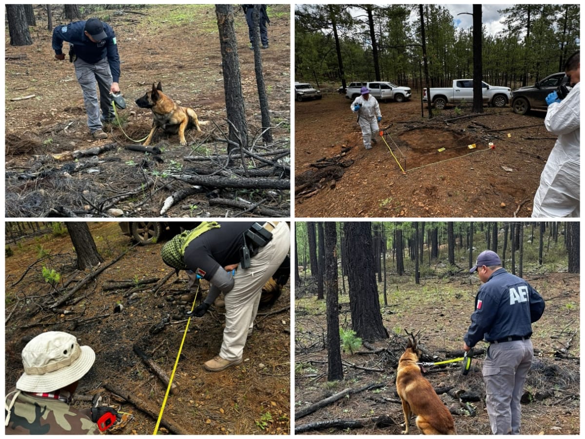 El hallazgo se registró en el lugar conocido como ejido “El Dos”, ubicado en el municipio de Madera, en donde se llevaron a cabo trabajos de prospección y búsqueda forense de forma aérea y terrestre.