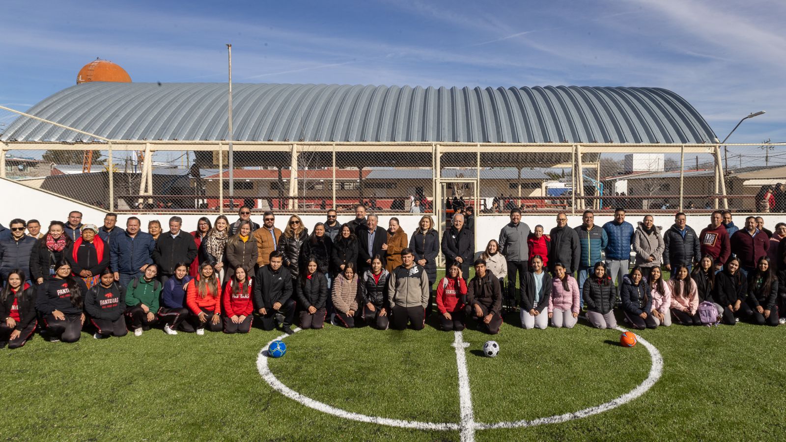 El alcalde Beto Pérez y el presidente seccional de Álvaro Obregón, Ignacio Malaxechevarría, encabezaron la entrega de una cancha de pasto sintético a la comunidad estudiantil de la Preparatoria 8403.