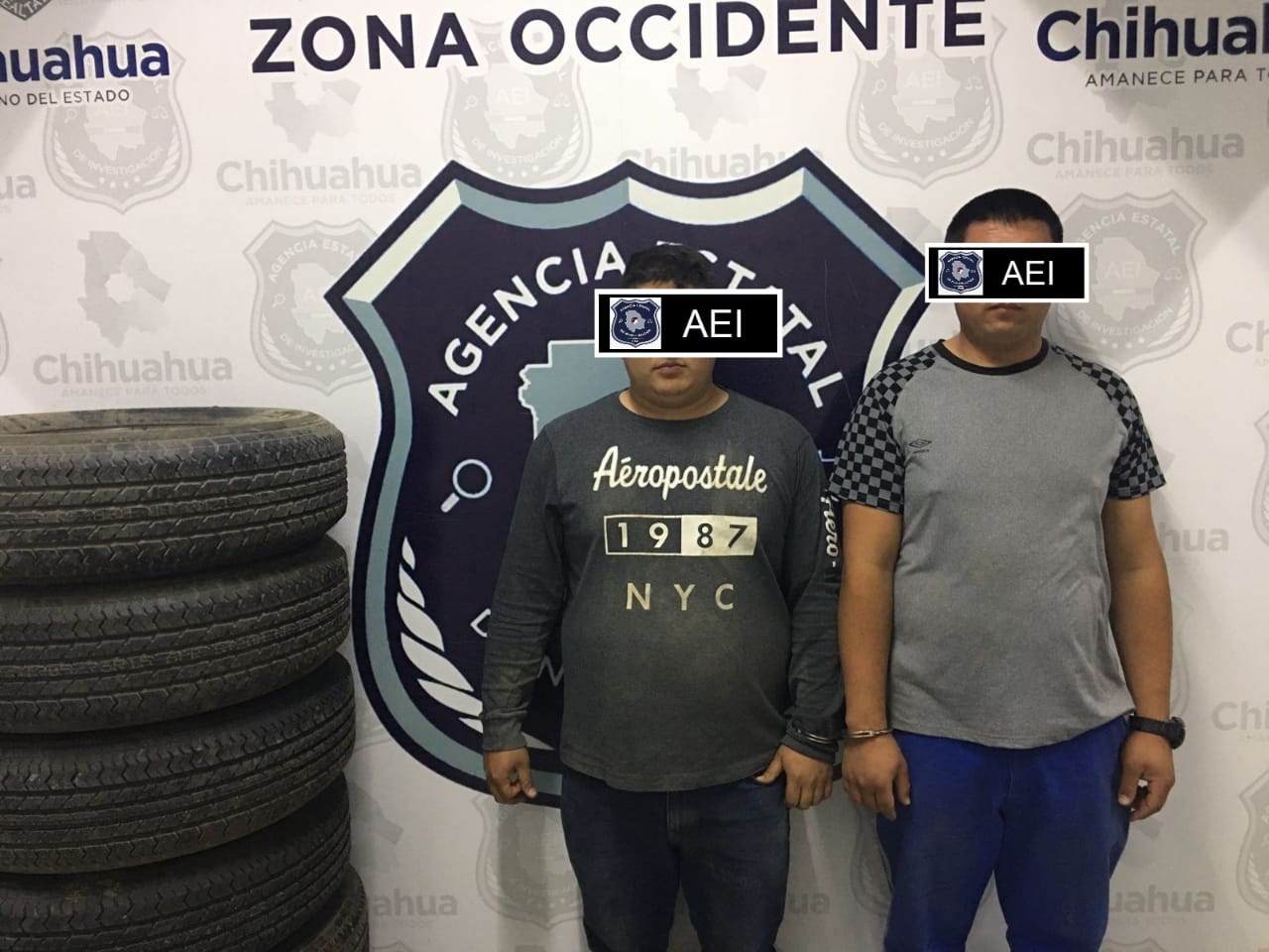 Cuauhtémoc.- Elementos de la Agencia Estatal de Investigación (AEI), detuvieron dentro del término de flagrancia a dos sujetos en posesión de llantas que habían sustraído de un negocio la noche de ayer.