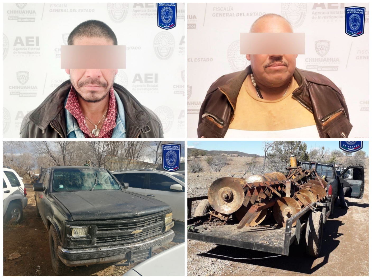 Elementos de la Agencia Estatal de Investigación, adscritos a la Fiscalía de Distrito Zona Occidente, detuvieron a dos hombres en posesión de maquinaria agrícola que fue robada de un rancho en Cusihuiriachi.