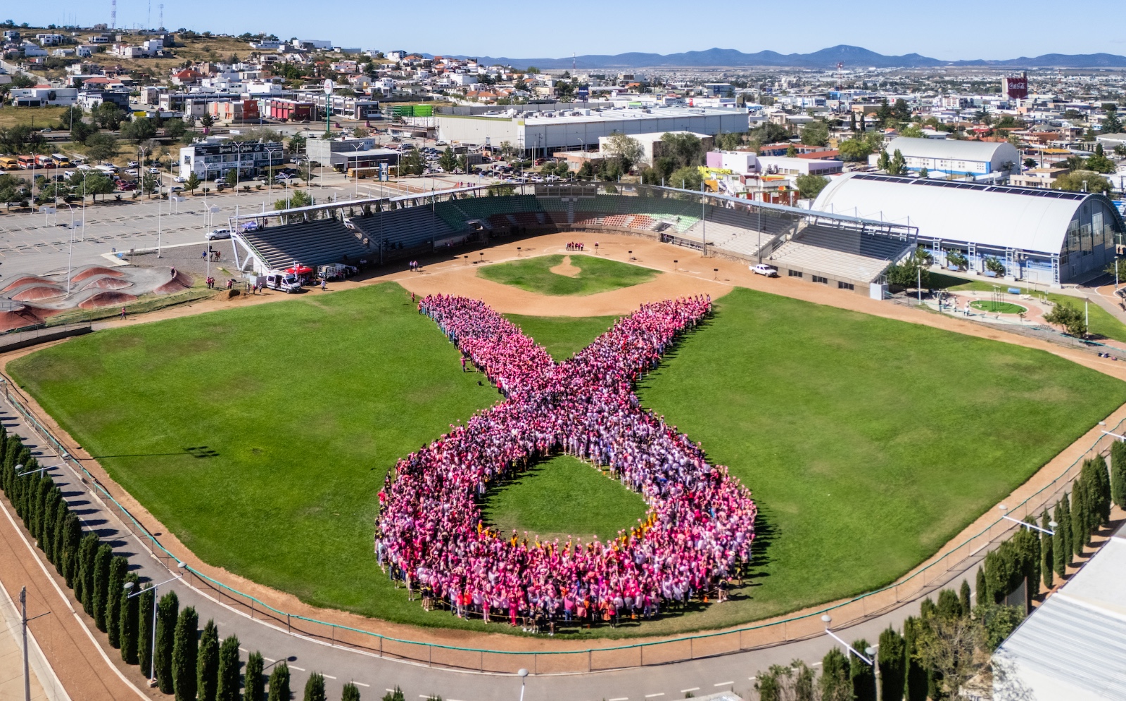El presidente municipal Beto Pérez encabezó el evento de la conformación del Gran Lazo Rosa, que contó con la participación de 5 mil personas, que se unieron para enviar un mensaje de prevención contra el cáncer de mama.