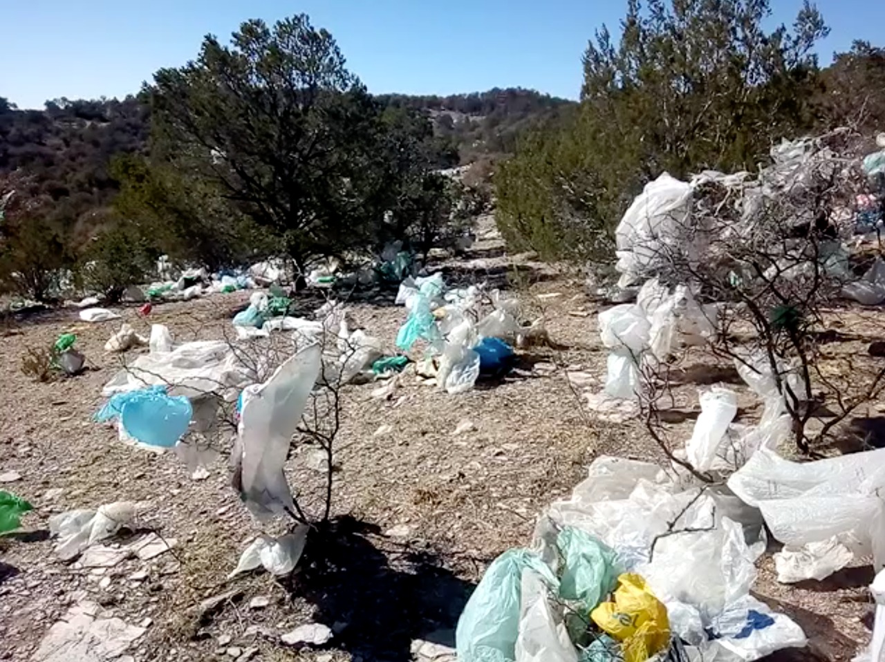 Los desechos ligeros del basurero municipal que fueron desplazados por los vientos fuertes a un perímetro considerable del propio tiradero, son recolectados por brigadas de la Dirección de Servicios Públicos del Gobierno Municipal de Cuauhtémoc, en coordinación con un grupo de pepenadores.