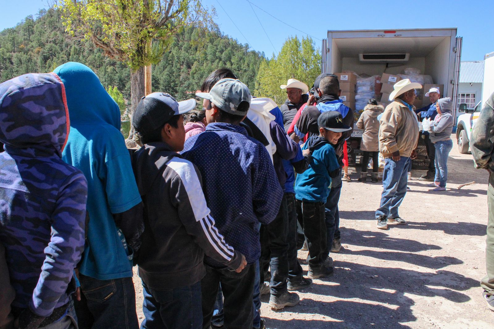 Posteriormente, el equipo de colaboradores se trasladó a Guachochi, donde se reunieron a los pobladores de las comunidades de Caborachi, Agua Azul y Rosanachi para proporcionarles el alimento.