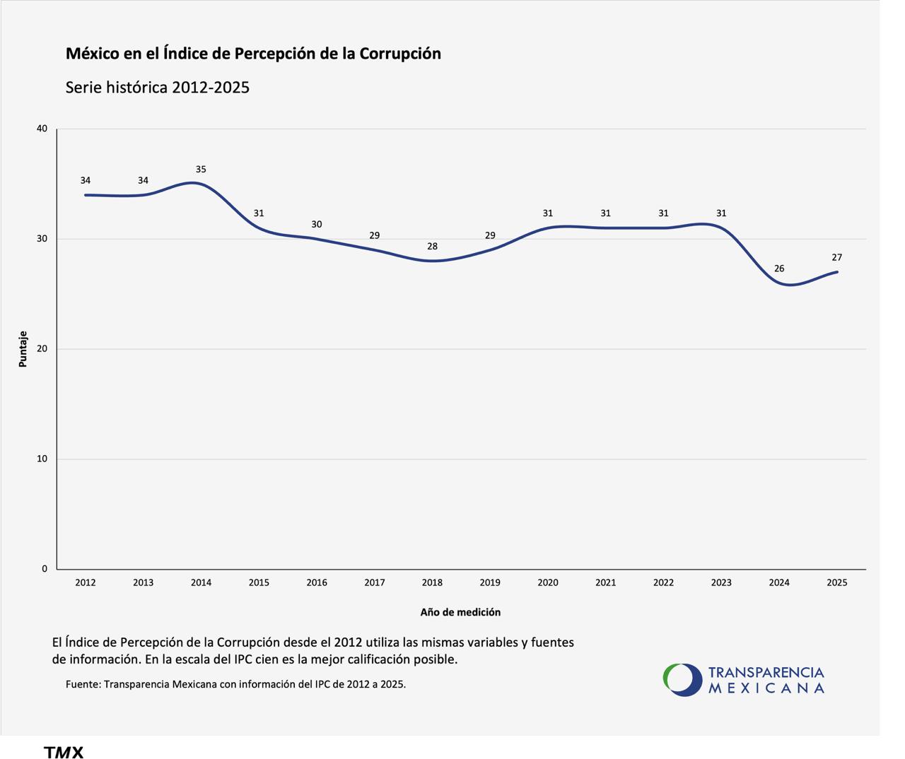 En 2025, México obtuvo una calificación de 27 puntos de 100 posibles. La escala del Índice de Percepción de la Corrupción va de cero –la peor evaluación para un país– a 100, la mejor calificación. Con 27 puntos, México se ubica en la posición 141 de 182 países evaluados.