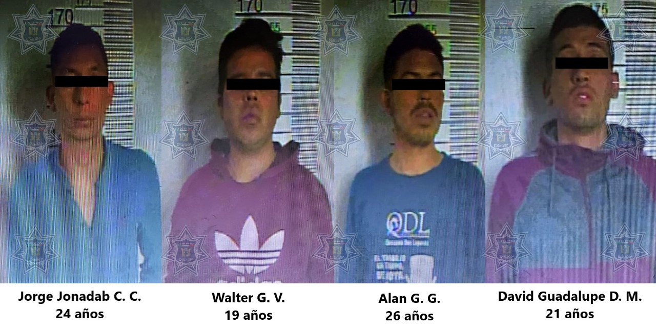 Los detenidos son Jorge Jonadab C. C. de 24 años, Walter G. V. de 19 años, Alan G. G. de 26 años y David Guadalupe D. M. de 21 años de edad, los cuales fueron asegurados junto con el vehículo en mención y consignados para su investigación ante la autoridad correspondiente.