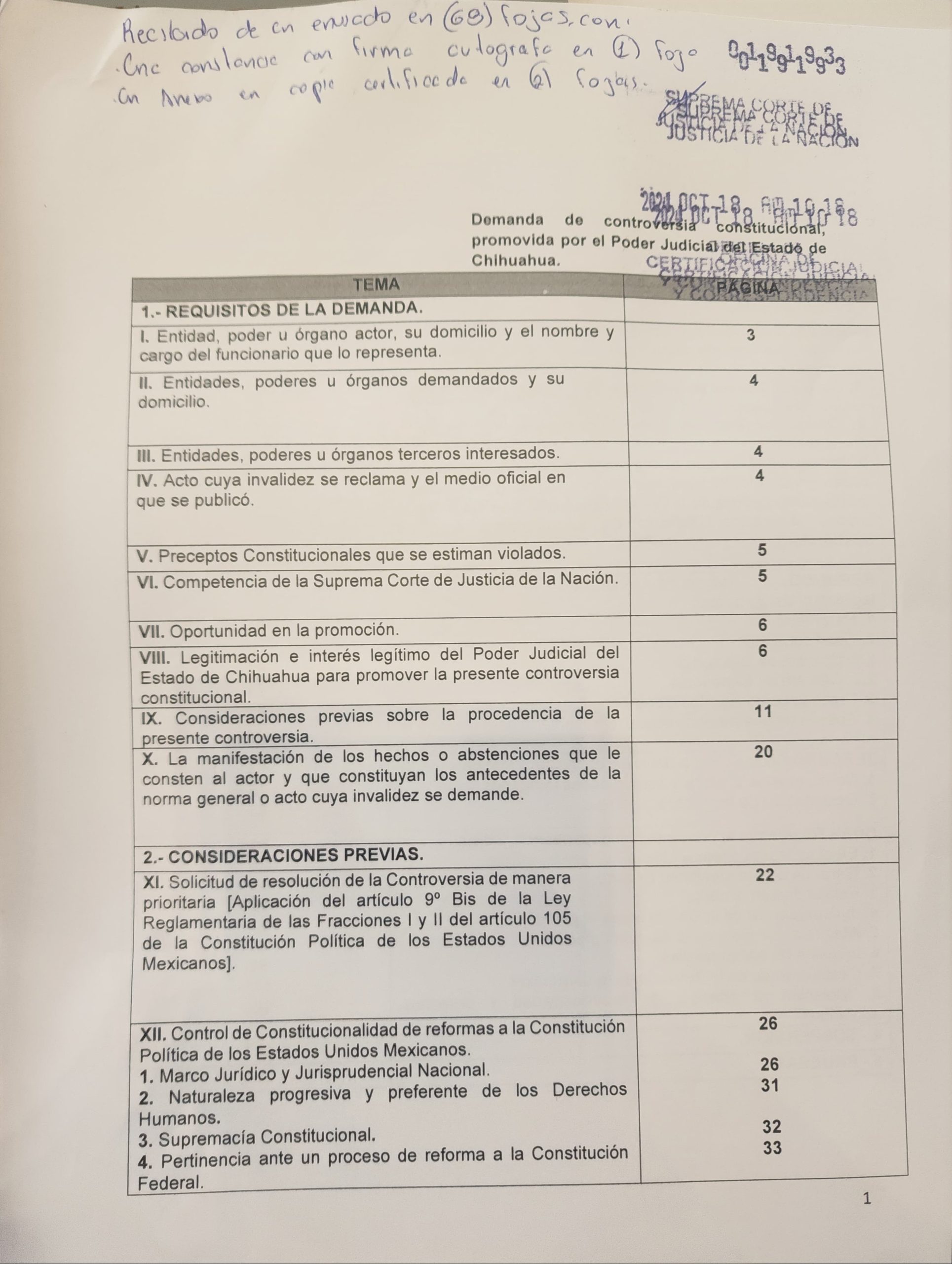 Ciudad de México.- La Magistrada Myriam Victoria Hernández Acosta, Presidenta del Poder Judicial del Estado de Chihuahua informa que, ha sido presentada ante la Suprema Corte de Justicia de la Nación, la demanda de controversia constitucional contra la reforma realizada a nivel federal. En punto de las 10:18 horas fue recibida la documentación en las instalaciones de la Suprema Corte de Justicia de la Nación en la capital del país.