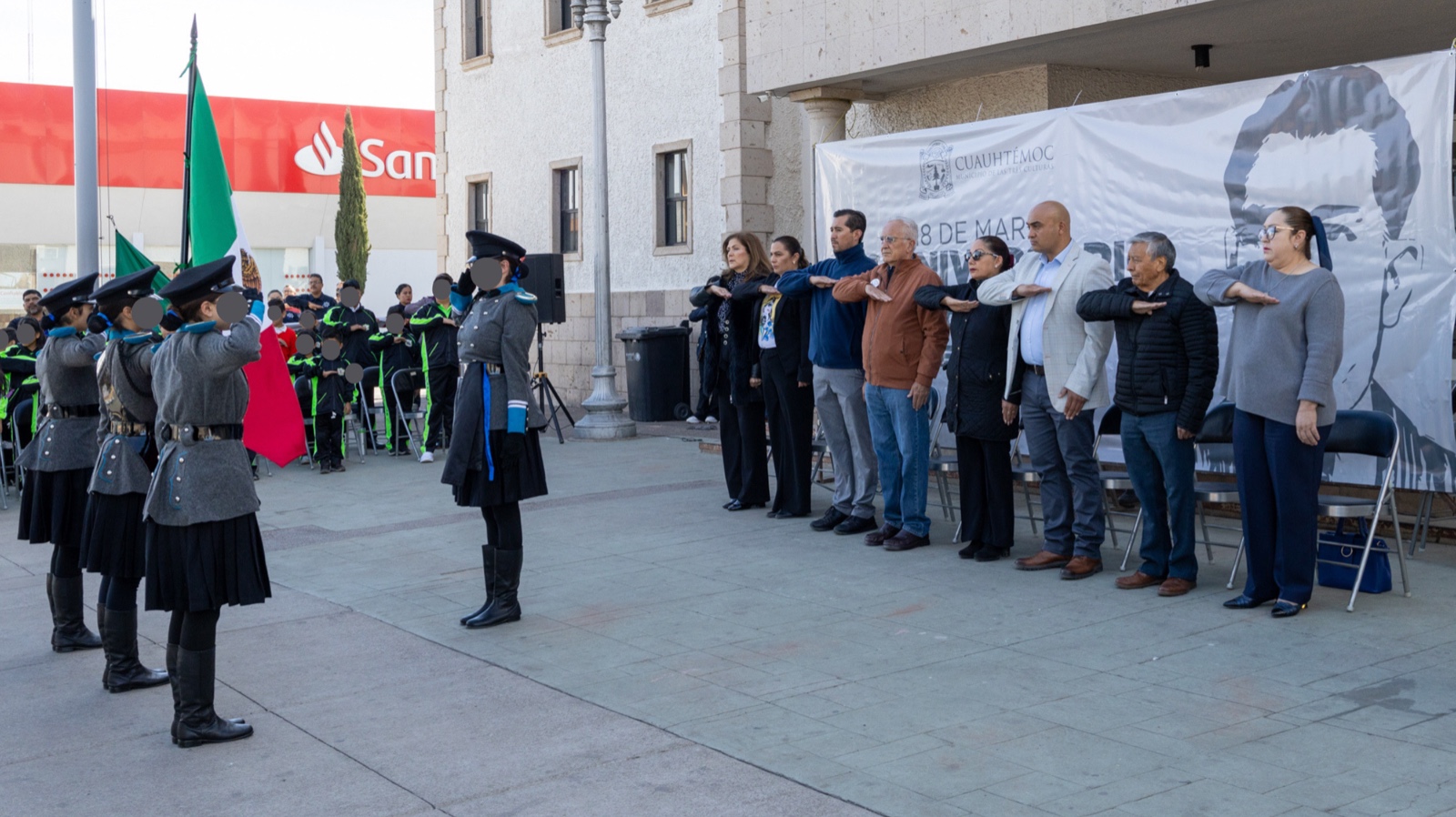 Cd. Cuauhtémoc, Chih.- Con la presencia de autoridades municipales y educativas, se llevó a cabo la ceremonia cívica con motivo del 86° aniversario de la Expropiación Petrolera, en la explanada de la Presidencia Municipal.